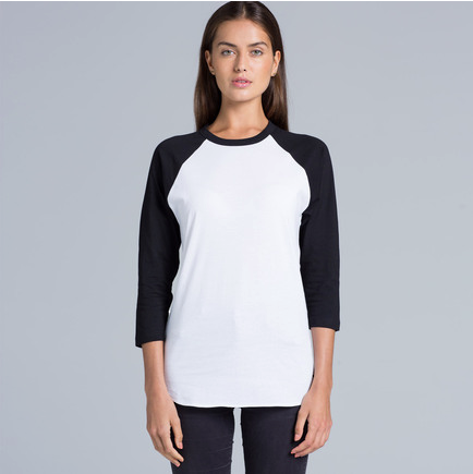Crew neck, ¾ length raglan sleeves, curved tails