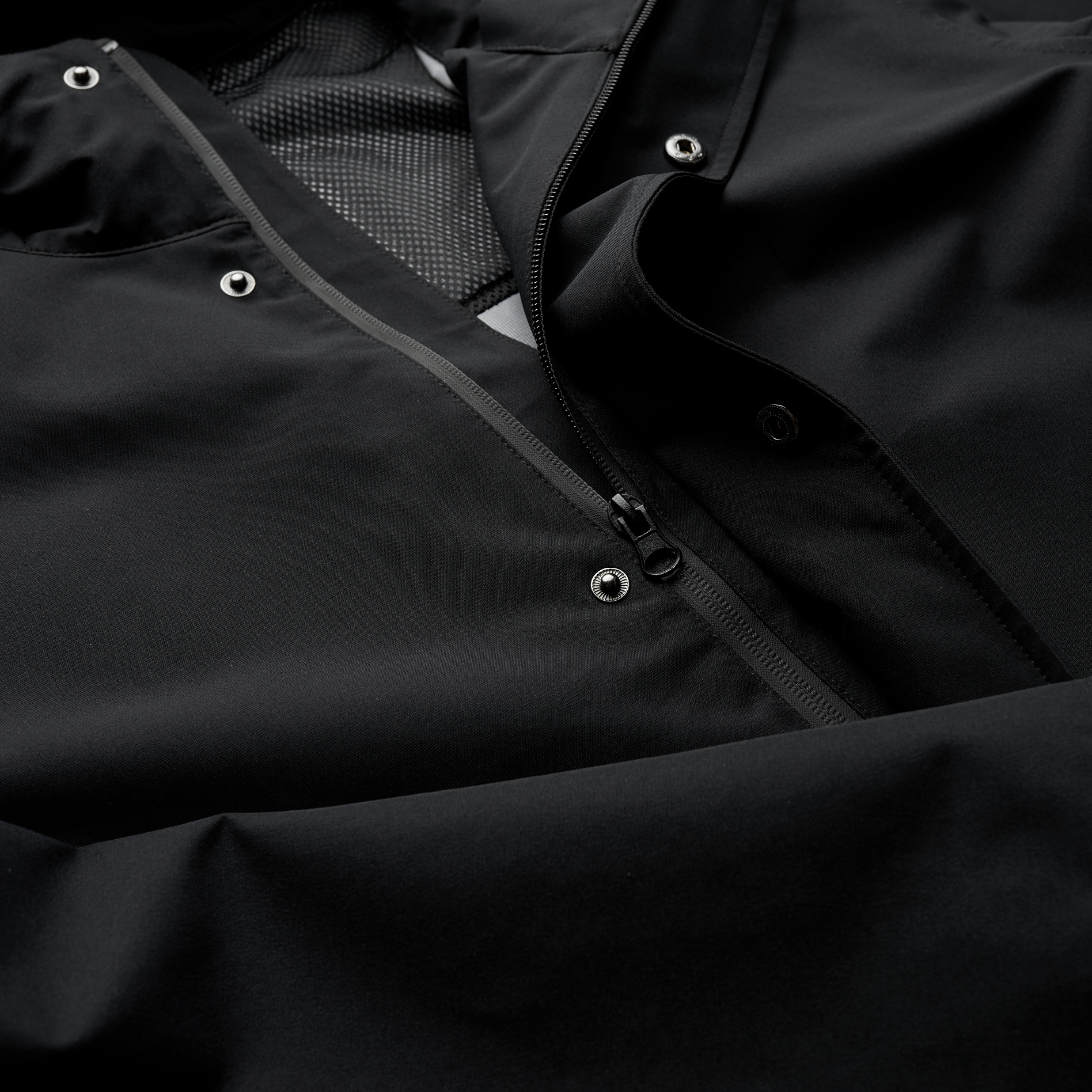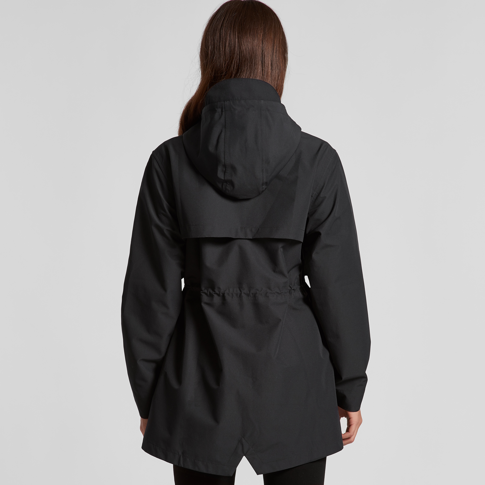 Seam sealed, waterproof zips, dome closure at CF and cuffs, yoke vent, internal cinch cord at hood, front pockets w/ welt covers